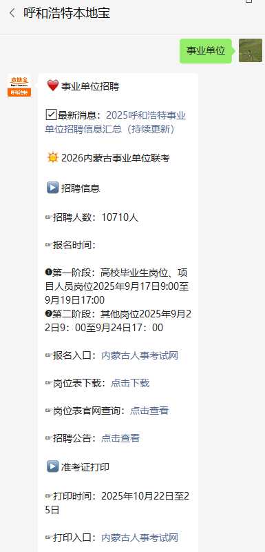 温馨提示:微信搜索公众号【呼和浩特本地宝】,关注后回复【事业单位】可获2026内蒙古事业单位联考报名+考试时间,报名官网入口/条件/流程图解,招聘公告及完整岗位表下载,咨询电话,准考证打印及成绩查询等。